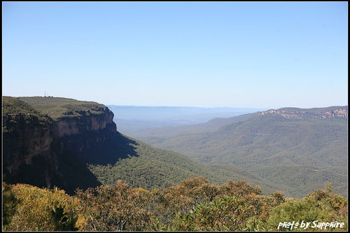 旅遊書上是說,因為有很多尤加利樹,太陽照射下,所放射出來的分子,會讓空氣看起來藍藍的,所以就被叫做Blue Mountain。